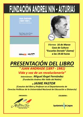 El viernes 16 de marzo, a las 19:30h en la Casa de Cultura "Escuelas Dorado" de Sama de Langreo se presentó el libro "Juan Andrade, vida y voz de un revolucionario", escrito por Pelai Pagès, Jaime Pastor y Miguel Romero. A cargo de la presentación estubo Miguel Ángel Fernández, compañero de la Fundación Andreu Nin -Asturies- y Jaime Pastor, coautor del libro y profesor de Ciencias Políticas en la UNED.