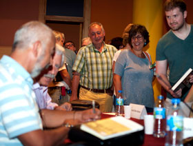 La perversión de la utopía Si echo la vista atrás, o me deslizo por los pliegues de la memoria (éstas fueron, más o menos, las primeras palabras con las que di comienzo a la presentación del acto en Langreo), no recuerdo que desde hace mucho tiempo haya habido un acontecimiento literario tan importante como éste. Una aseveración de la que daba fe el numerosísimo público congregado en la Casa de la Cultura Alberto Vega de La Felguera (alrededor de 200 personas: hubo que traer sillas suplementarias) que acudió el pasado sábado 16 de junio al “Encuentro con Leonardo Padura — que nos habló de su excepcional novela “El hombre que amaba a los perros”— y con LLuis Juste de Nin —que presentó la novela gráfica: “Andreu Nin, siguiendo tus pasos”. Padura: "No descarto que Asturias aparezca en uno de mis libros"El escritor cubano realizó un encuentro con sus lectores en los valles mineros17/07/2016 Langreo, Julio VIVAS para lanuevaespaña.es. El escritor cubano Leonardo Padura, premio "Princesa de Asturias" de las Letras 2015, visitó ayer los valles mineros para participar en un encuentro con los lectores. Una cita que, como afirmó, "tenía pendiente desde hace muchos años y que por fin he podido llevar a cabo". No estaba solo, le acompañó el artista gráfico Luis Juste de Nin. Juntos compartieron con el público, que llenó la Casa de Cultura Alberto Vega del distrito langreano de La Felguera, sentimientos y anécdotas que sin duda hicieron muy amena la velada. El acto fue presentado por Javier García Cellino, colaborador de LA NUEVA ESPAÑA y miembro de la Fundación Andreu Nin en Asturias, que organizó el encuentro. Además de la cita dentro de la Casa de Cultura langreana, los actos de la "Semana negra" en las Cuencas incluyeron una visita al ecomuseo minero de Samuño, donde los participantes pudieron comprobar de primera mano cómo se desarrollaba el oficio de minero. Padura aseguró que era la primera vez que venía a Langreo, pero no a las Cuencas. "En las primeras 'semanas negras' había una disposición a realizar excursiones por los distintos pueblos de Asturias y conozco bastante esta zona, Langreo es de lo poco que me quedaba por ver", destacaba minutos antes de comenzar el encuentro literario. El escritor también dio cuenta de su estrecha relación con el Principado, "con la que tengo una conexión muy fuerte, ya que el primer pie que puse en España fue en la 'Semana negra" de 1988, y desde entonces mi relación con Asturias ha sido muy intensa y sentimental". De hecho, afirmó que "no descarto que Asturias aparezca en uno de mis próximos libros". Sería la segunda vez que una comunidad española aparece en sus publicaciones. Ya lo hizo con Cataluña, señalando que "aunque es una historia que ocurre en Cuba, tiene que ver con una virgen negra catalana que llegó a Cuba". Tampoco obvió su último galardón, el "Princesa de Asturias" de las Letras, "que ya fue como para decirme que tengo que pedir la nacionalidad asturiana", apuntaba entre risas. El escritor aludió al protagonista de sus novelas policiacas, Mario Conde, y su coincidencia con el conocido banquero español. "Ya sabía de su existencia cuando escribí la primera novela, pero nunca pensé que se fuera a publicar en España; mi personaje se llama Mario Conde por razones que nada tienen que ver con el español, pero curiosamente, cuando sale este nombre, muchas personas piensan primero en mi personaje porque es mucho más simpático que el español". Luis Juste de Nin, por su parte, aprovechó para presentar su novela gráfica "Andreu Nin, siguiendo tus pasos". El artista destacó que Nin "fue el primo materno de mi madre, pero en mi casa nunca se hablaba de él, tampoco de la guerra, y no me enteré de su valor hasta que pasé la adolescencia". Tras indagar sobre su persona, Juste de Nin descubrió que su primo segundo "fue asesinado por ser revolucionario, pero no solo eso, fue un heterodoxo, un gran hombre de acción y libre de pensamiento". |