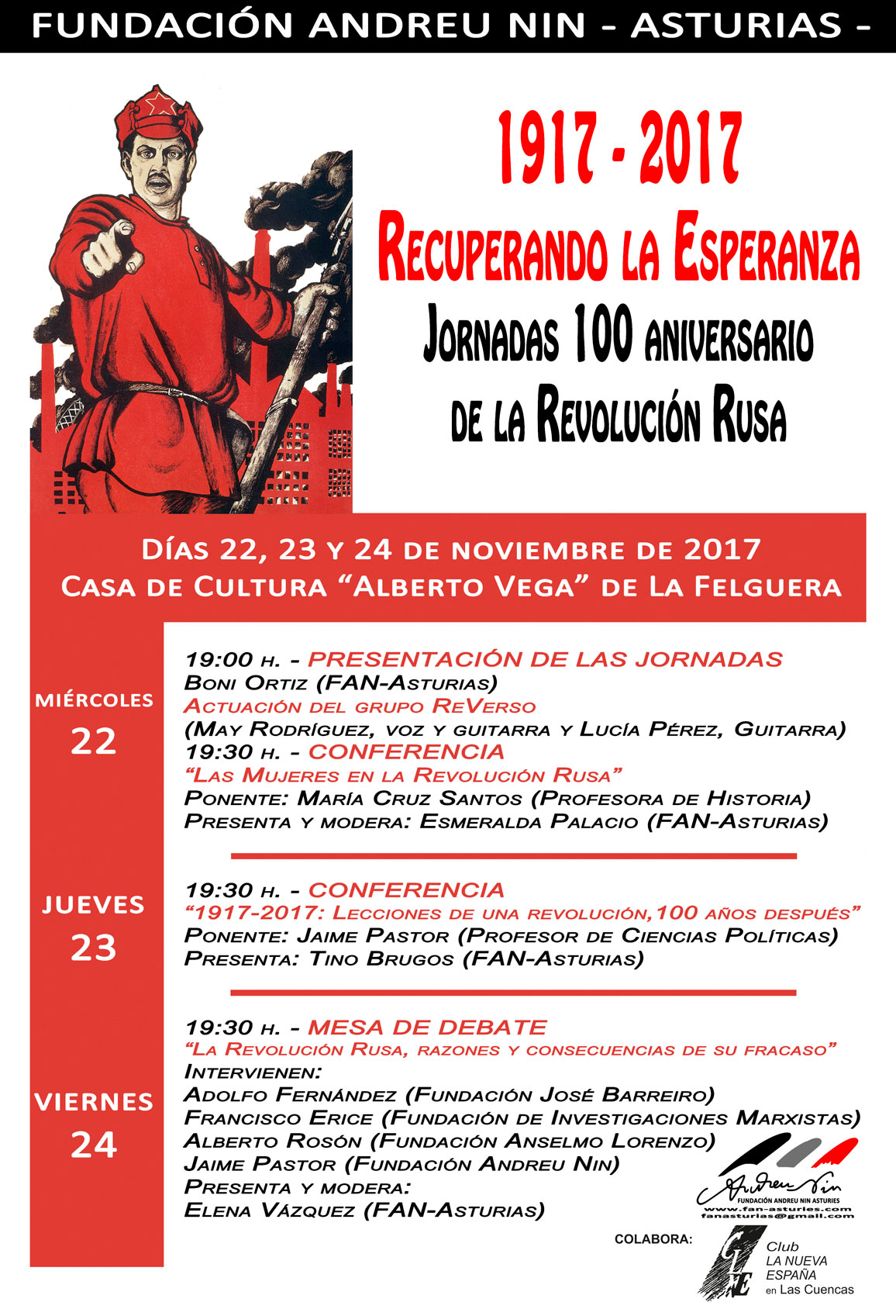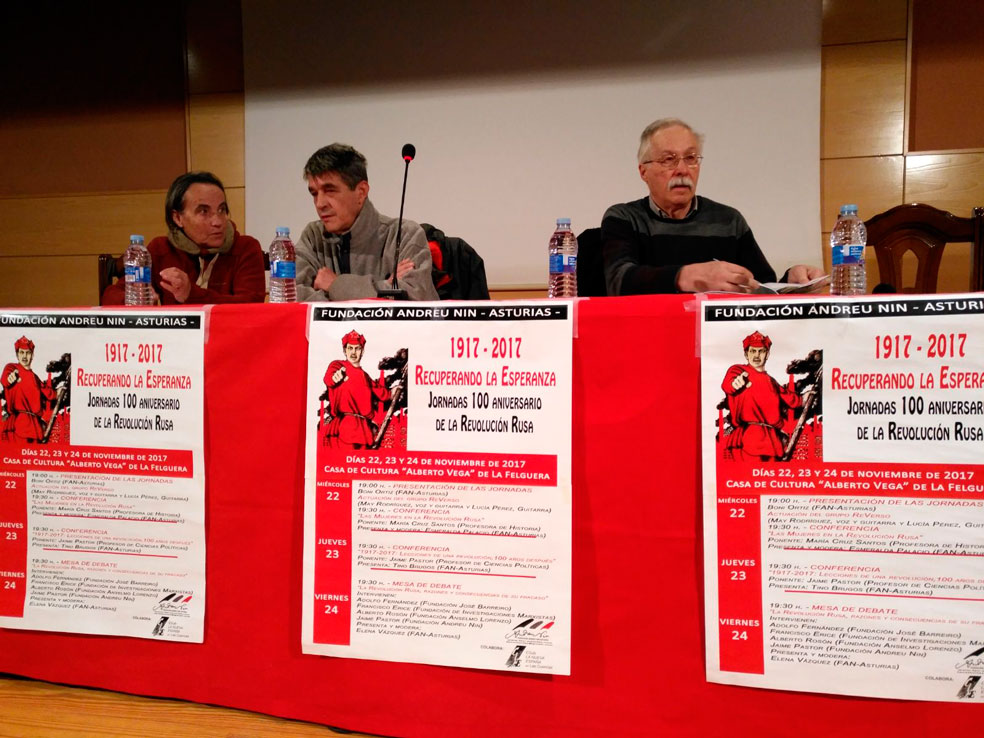 | Día 24 a las 19:30 h. MESA DE DEBATE: ”La Revolución Rusa, razones y consecuencias de su fracaso” Participan: Fundación José Barreiro, Fundacion de Investigaciones Marxistas, Fundación Anselmo Lorenzo y Fundación Andreu Nin. presenta y modera: Elena Vázquez de la FAN de Asturias |