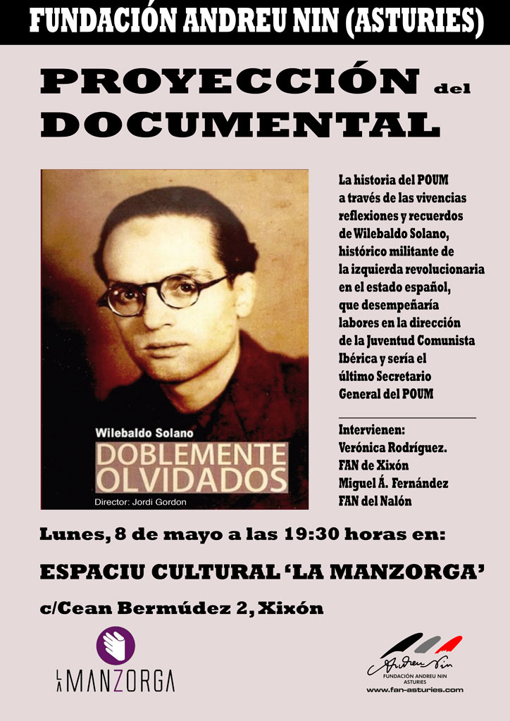 La Fundación Andreu Nin de Asturies, celebró un acto con la proyección del documental "Doblemente Olvidados" de Jordi Gordon en el Espaciu Cultural 'La Manzorga' de Xixón. Intervienen: Verónica Rodríguez y Miguel Á. Fernández |