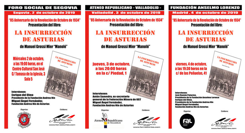 de Octubre de 1934, la presentación del libro “La Insurrección de Asturias” de Manuel Grossi en Segovia, Valladolid y Madrid |